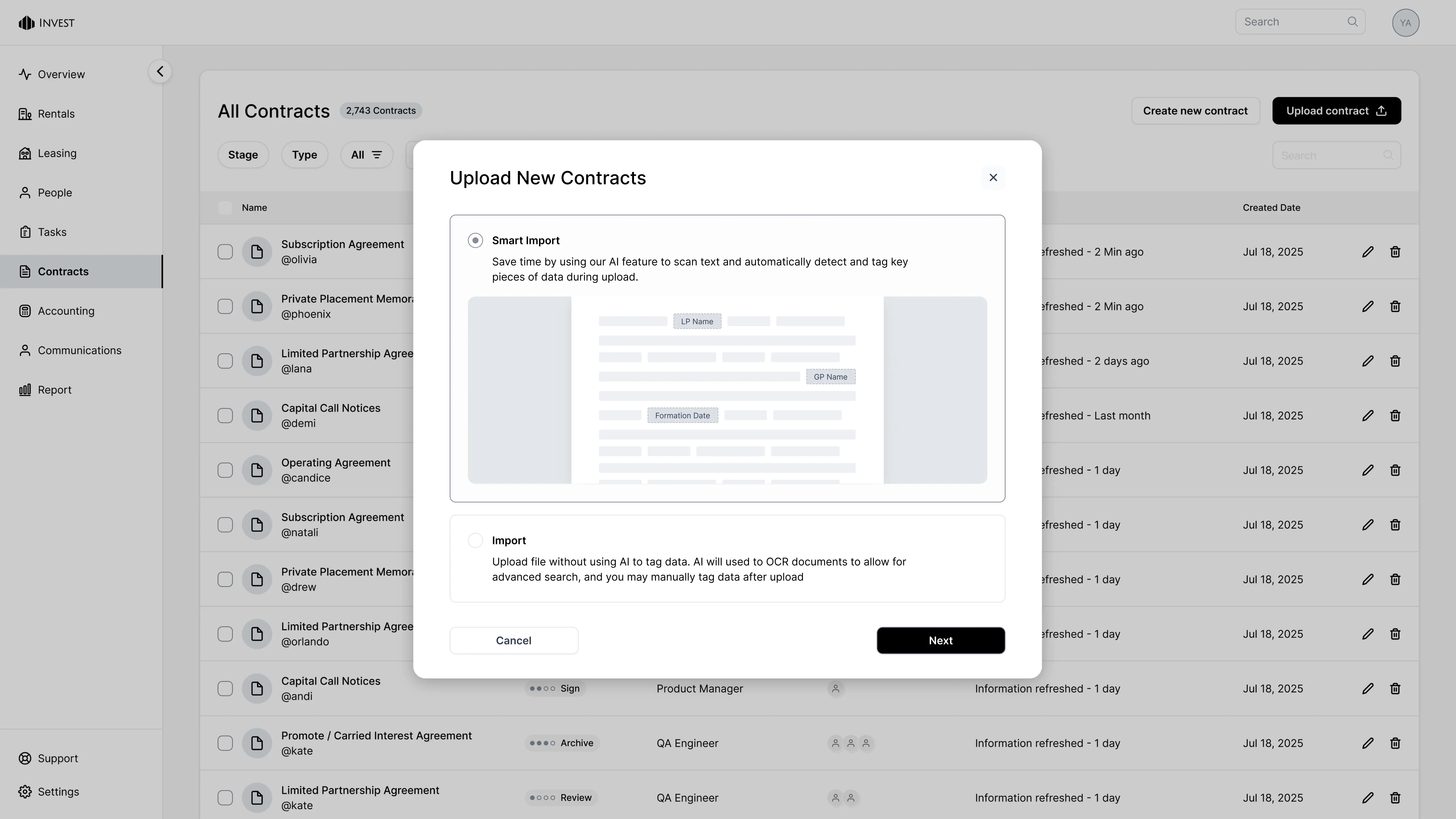 Users can easily create a new contract or import an existing document into the system for fast setup.